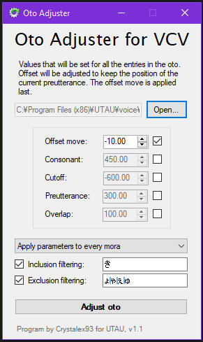 - Automatic oto.ini generation.- Base oto.ini adjustments.- Uniform oto.ini values.